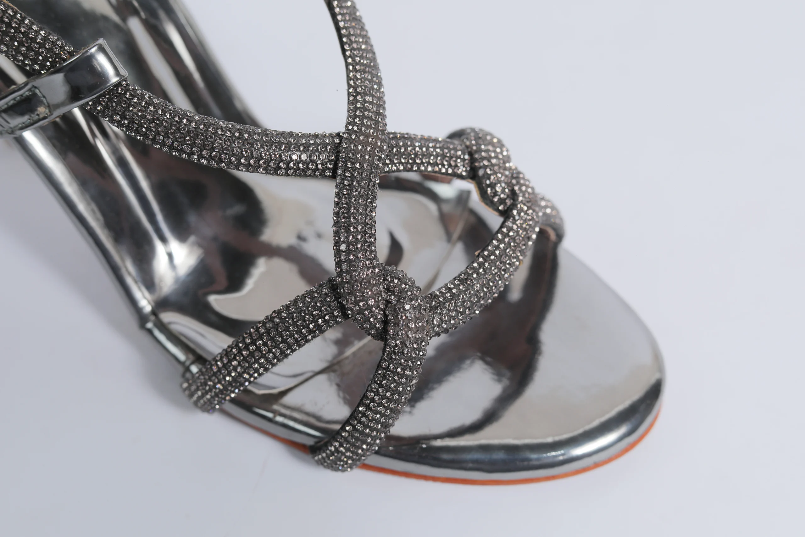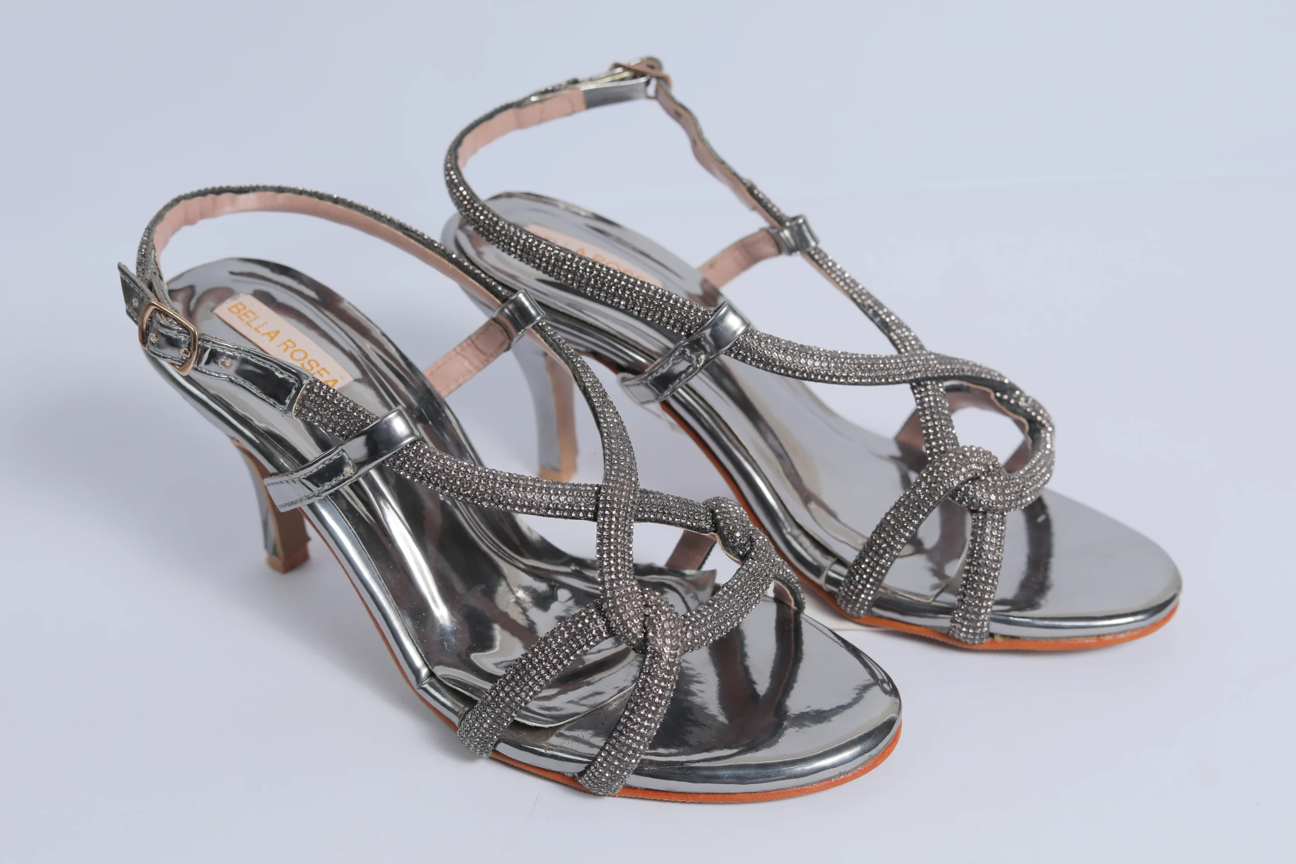 Elegant metallic silver heels detailed with fine crystal-embellished straps for a delicate evening glow.Designed with a secure ankle buckle, cushioned footbed, and 3 Inch slim heel for effortless comfort.Perfect for formal occasions.