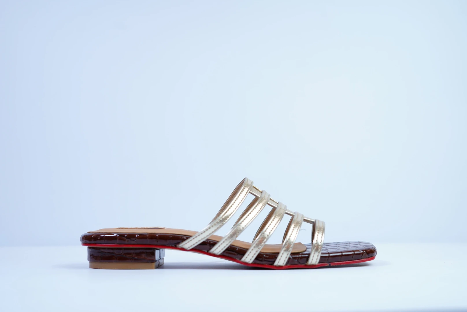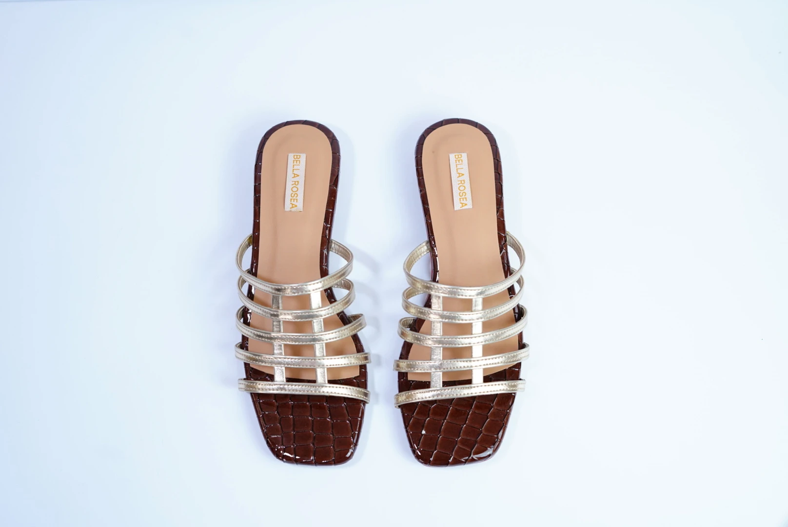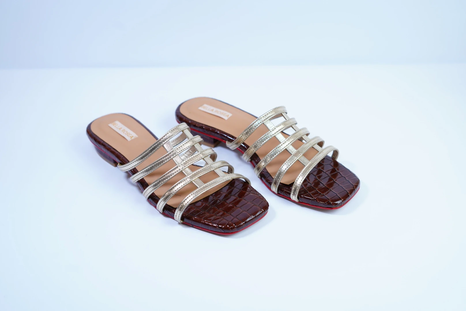This flat sandal features multiple slim straps across the front, layered in a parallel pattern for a secure and elegant fit.