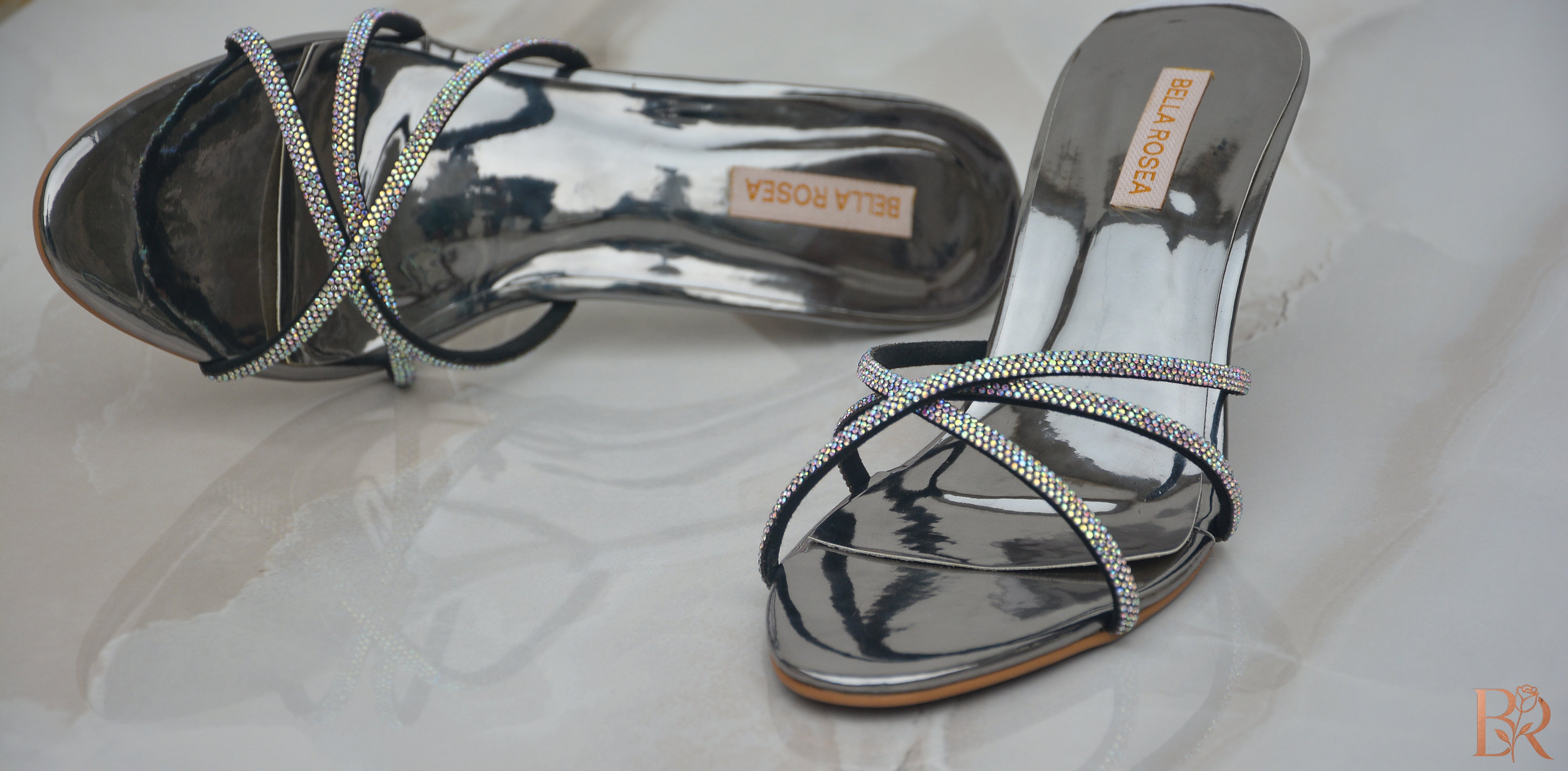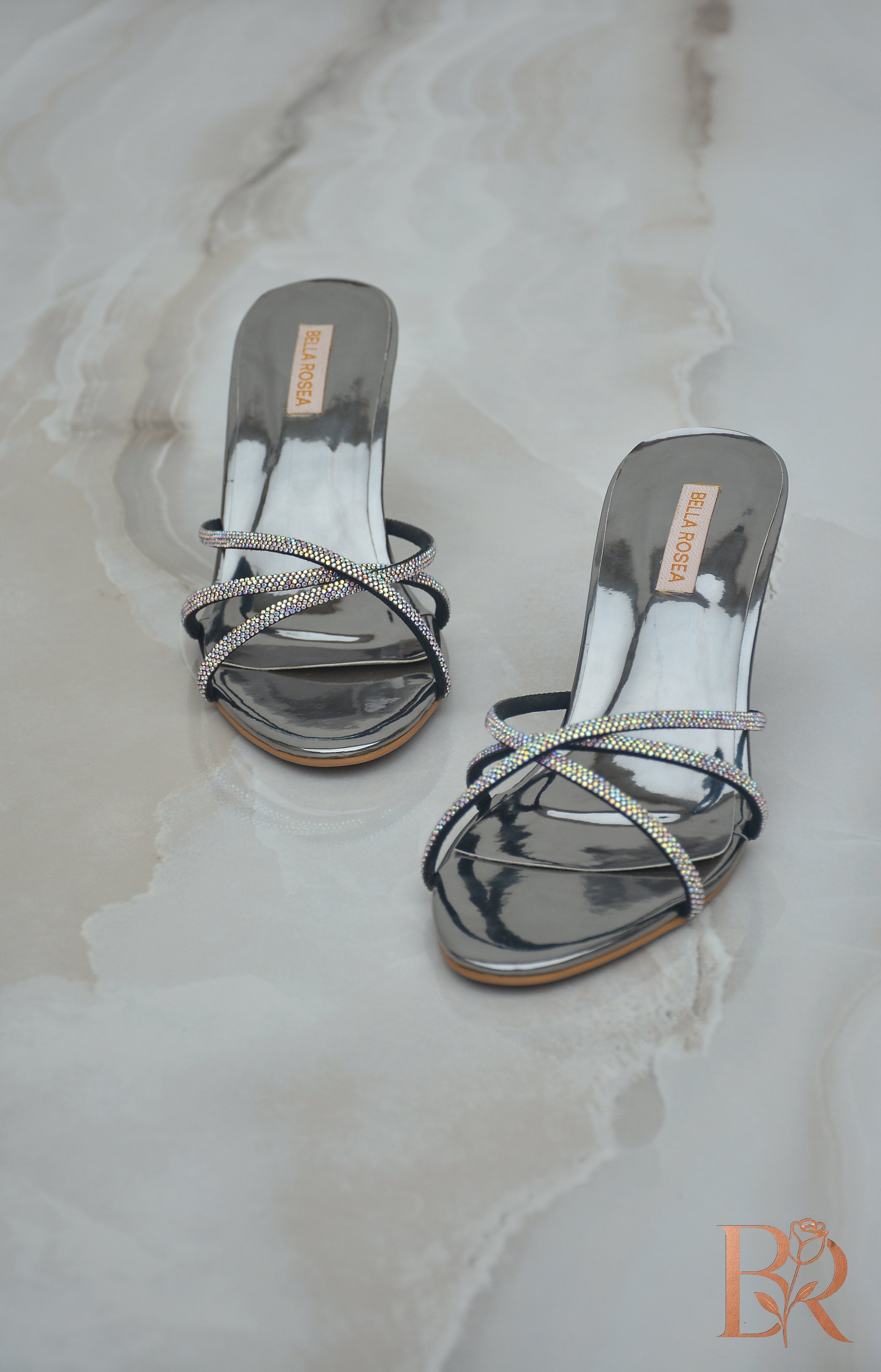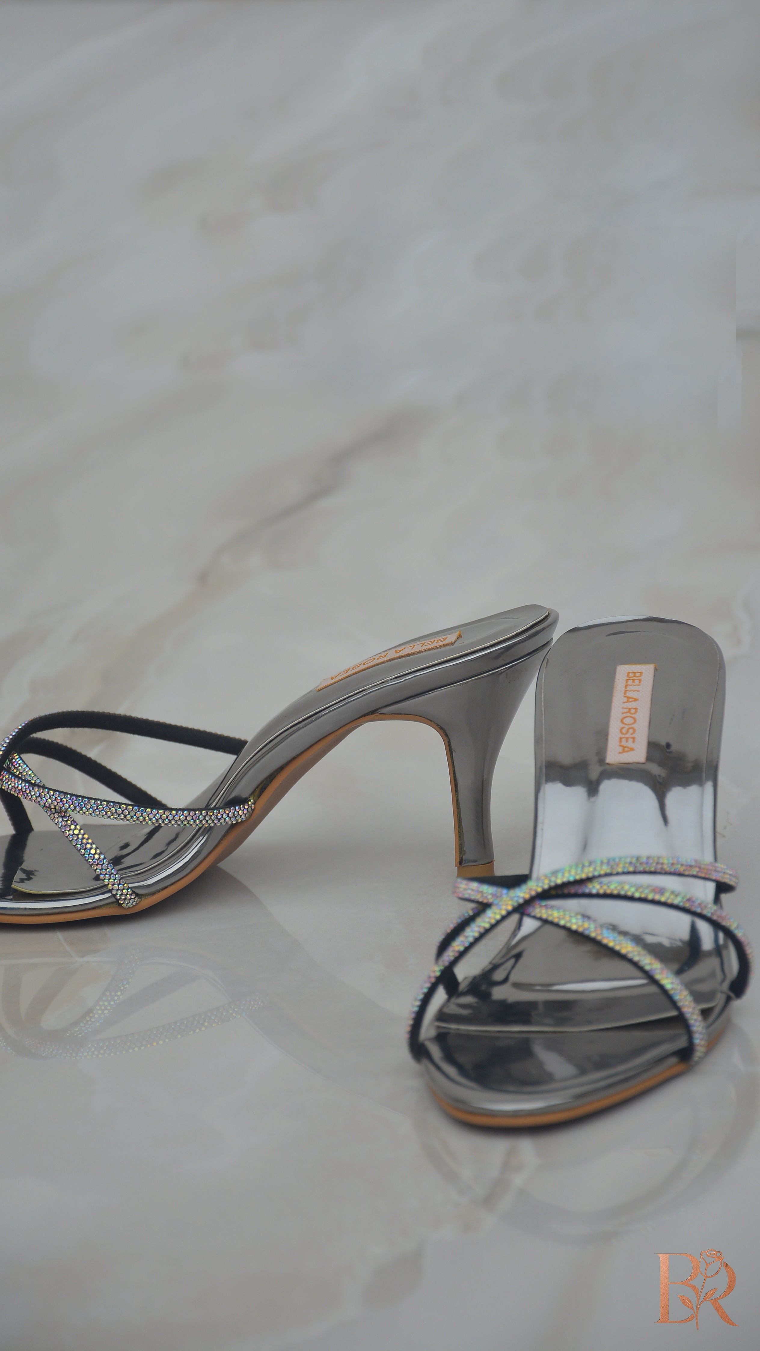 Elevate your style with the Amira Heel, a dazzling creation from Bella Rosea. Designed in a sleek metallic black finish, this heel is adorned with shimmering multi-crystal straps that cross gracefully, adding a modern sparkle to every step.