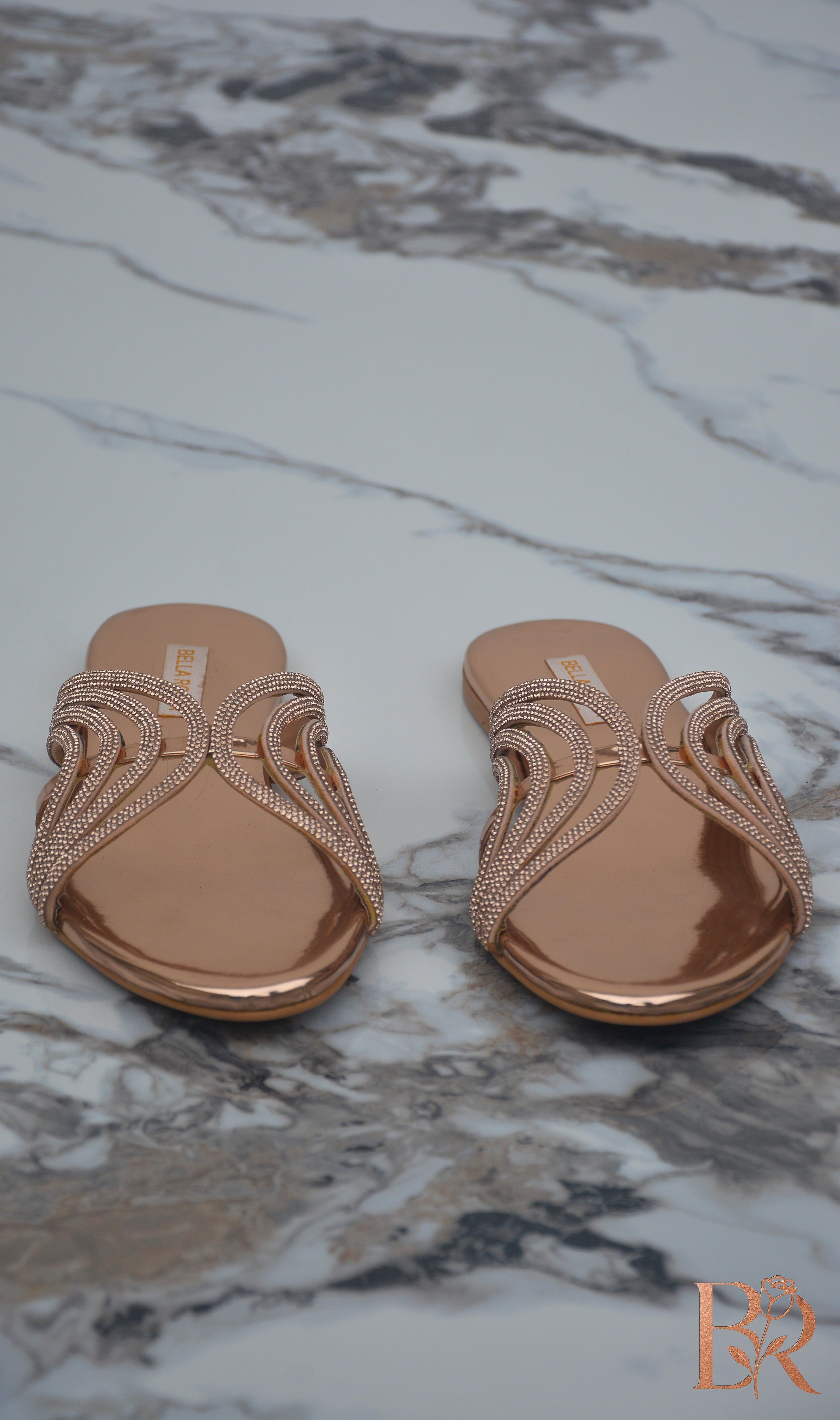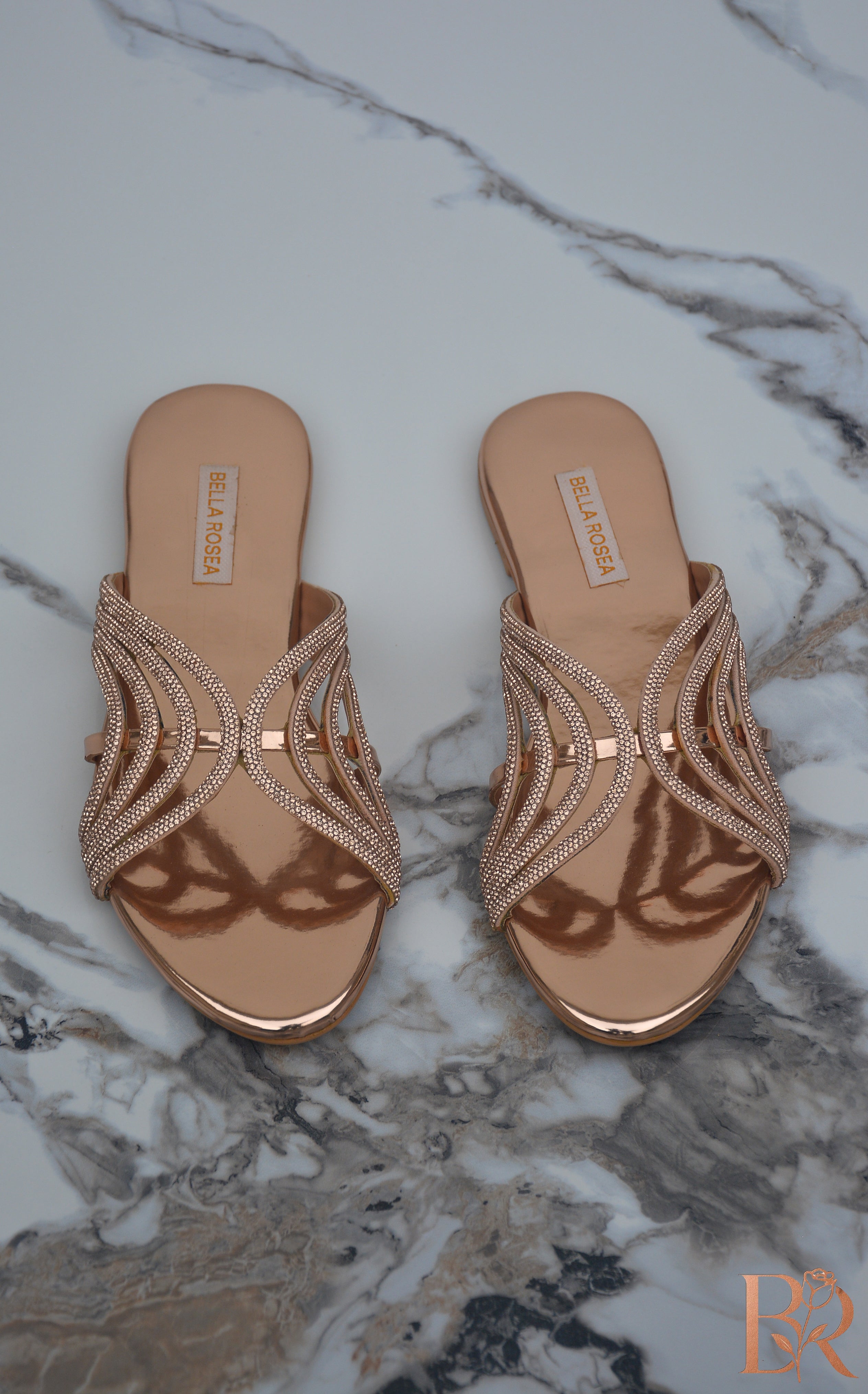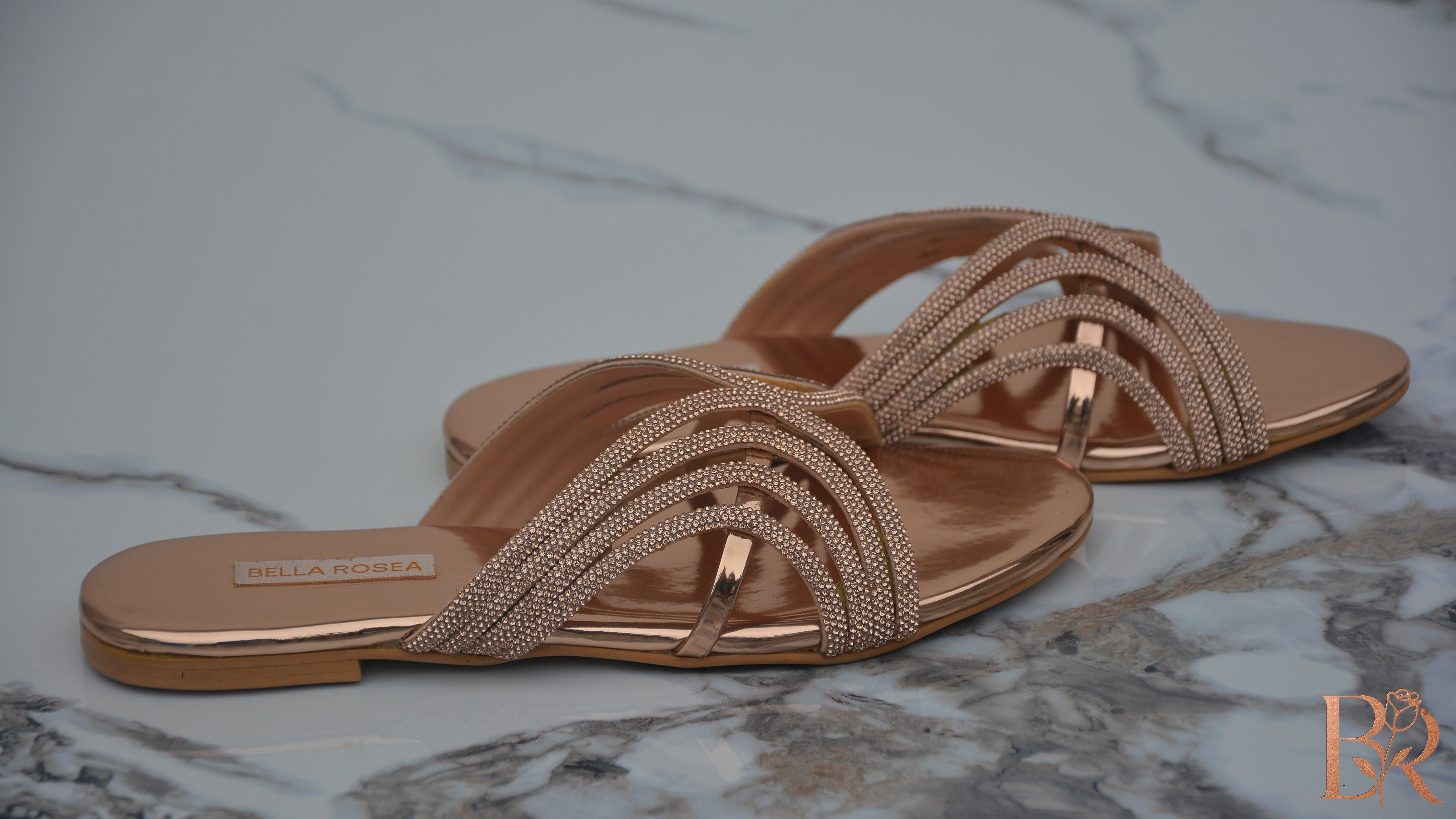 Step into radiant sophistication with the Asmara Rose Gold flats from Bella Rosea. Designed in a lustrous metallic rose gold finish, this pair is elevated with shimmering crystal-detailed straps that curve gracefully across the foot, creating a look of effortless luxury.