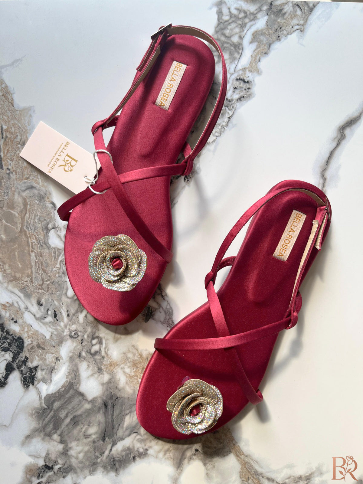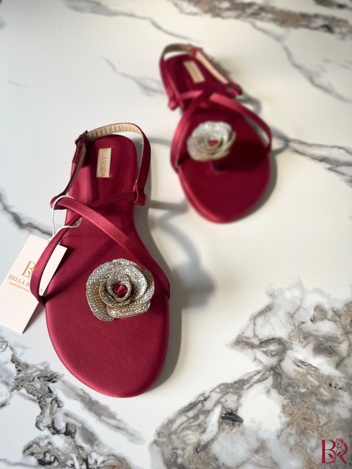Capture the spotlight with "The Maroon Blossom" flats from Bella Rosea—a shoe designed for making a sophisticated, unforgettable statement. These exquisite sandals seamlessly blend luxurious texture with a brilliant, eye-catching centerpiece.
